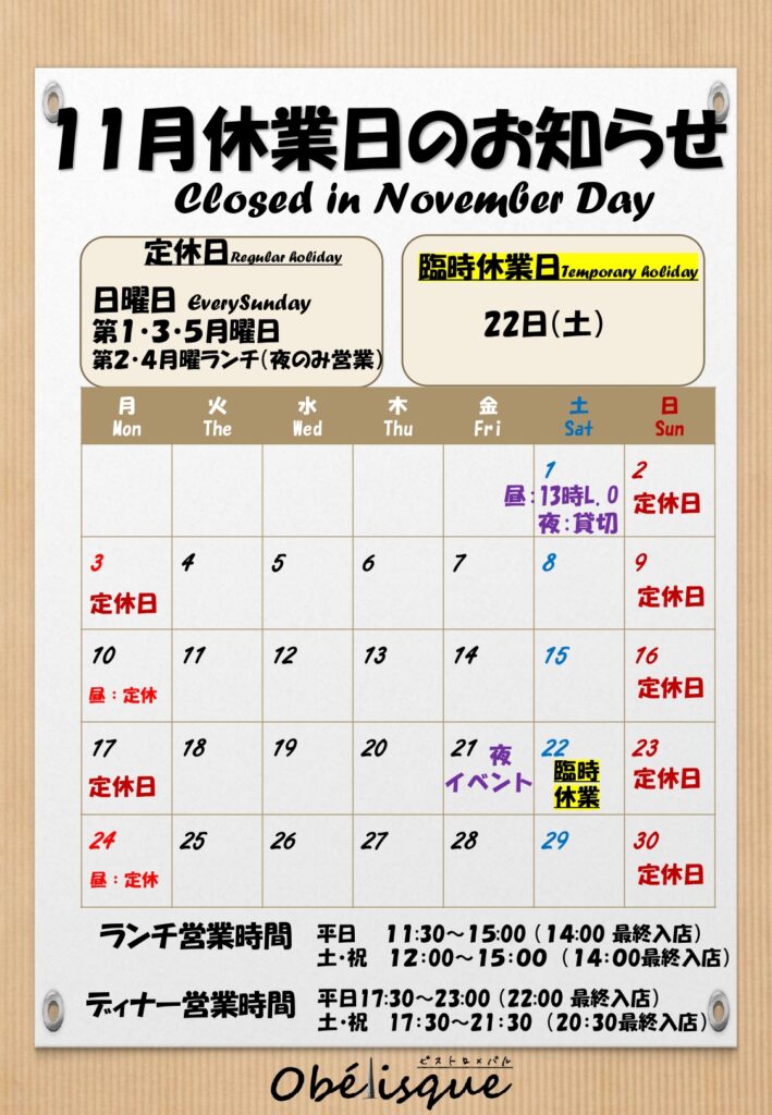 11月の店休日をお知らせいたします